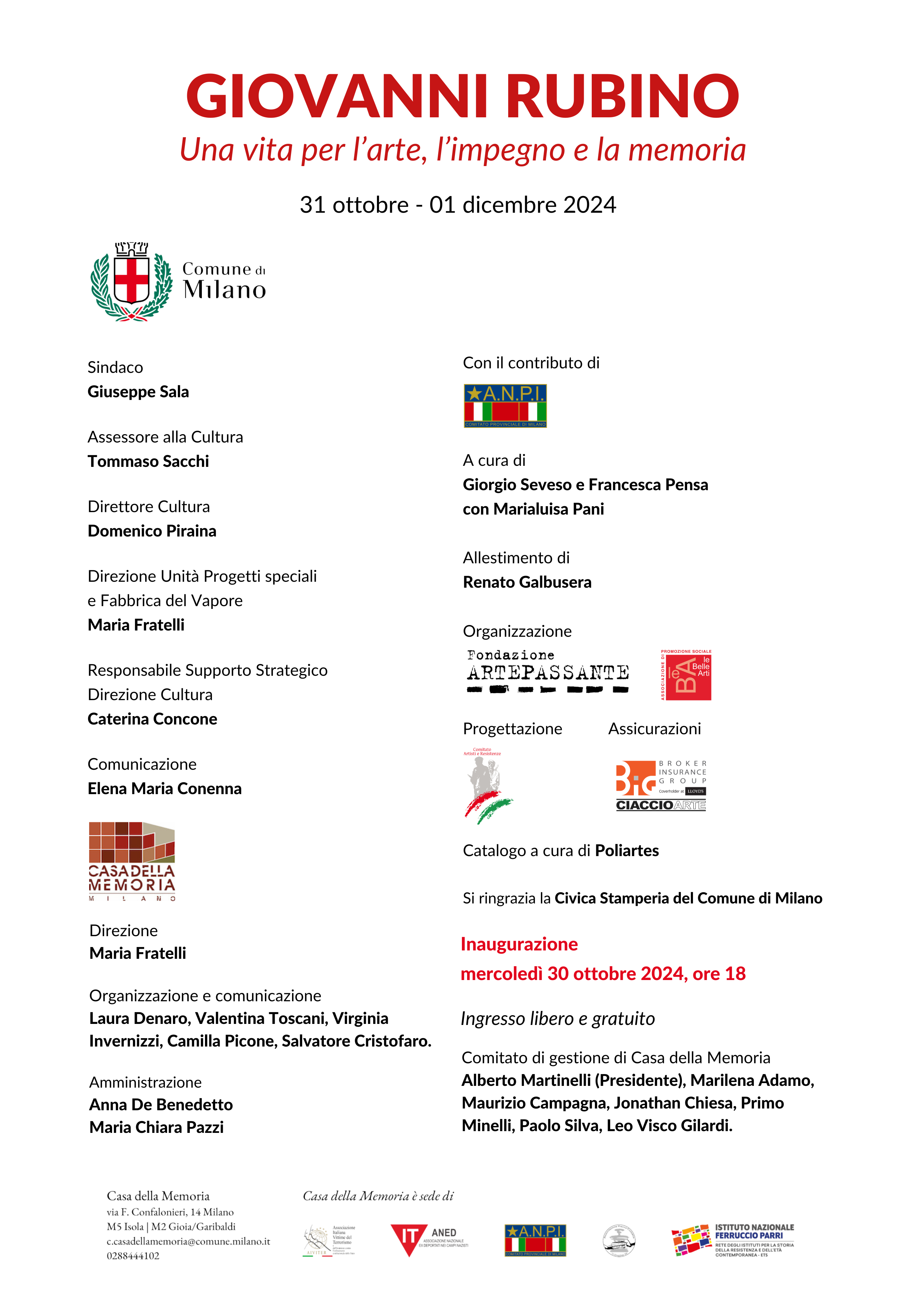 All'inaugurazione di mercoledì 30 ottobre alle 18 interverranno i curatori Francesca Pensa e Giorgio Seveso con Maria Fratelli (Direttrice Unità Progetti Speciali e Fabbrica del Vapore – Direzione Cultura), Primo Minelli (Presidente di ANPI Provinciale Milano) e Renato Galbusera (Fondazione Artepassante).