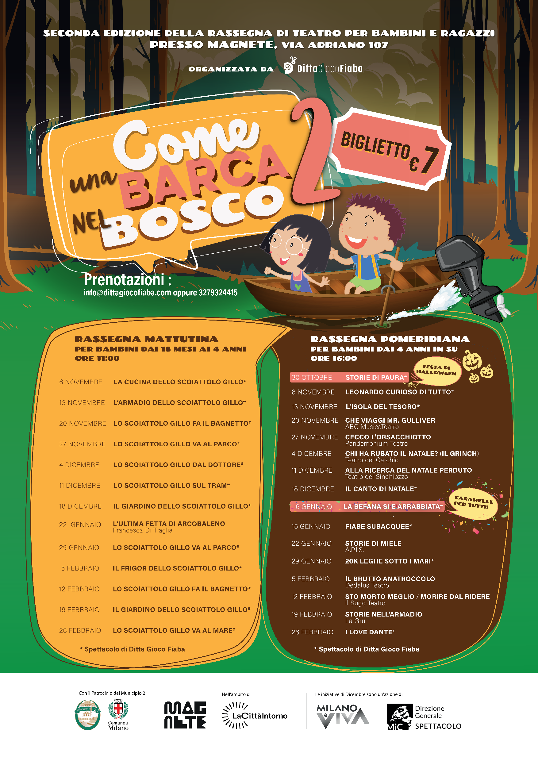 Ditta Gioco Fiaba, insieme ai partner del progetto e col patrocinio del Municipio 2, offrirà al pubblico ogni domenica spettacoli per famiglie con una proposta mattutina per bimbi fino ai 4 anni, ed una pomeridiana più adatta a bambini e ragazzi con un'età superiore.